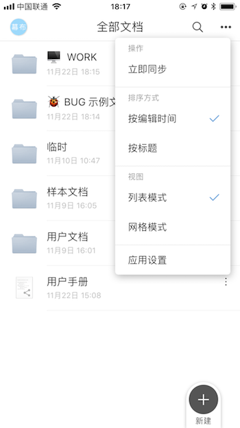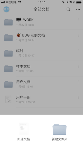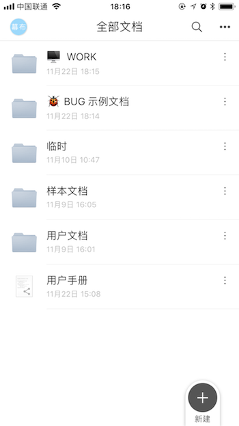 点击右下角「+ 新建」按钮,可以建立一个新的文档或者文件夹。