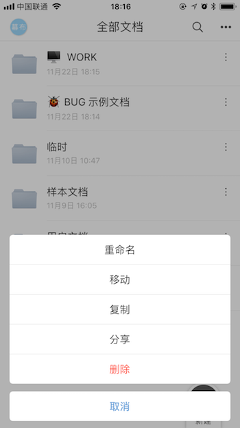 点击文档或文件夹右侧对应的「…」按钮,可对文档进行重命名、移动、复制、分享、删除等操作。